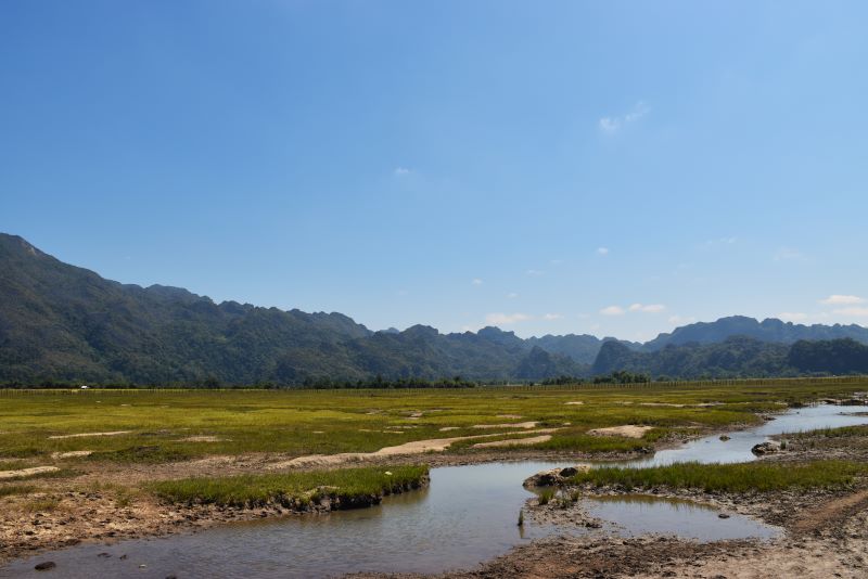 The dirt road is in excellent condition and its just a 10 minute drive across open paddy fields in front of spectacular karst limestone mountains. The road leads to a secluded oasis of blue water emerging from a spring at the base of a limestone cliff. There are a few small restaurants and changing rooms here, making it an excellent place to stop and have a refreshing dip.